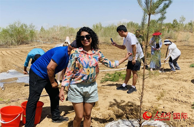 格魯吉亞網(wǎng)紅博主桃漫與治沙工人一起為栽種的樹苗澆水。人民網(wǎng)記者 吳思萱攝
