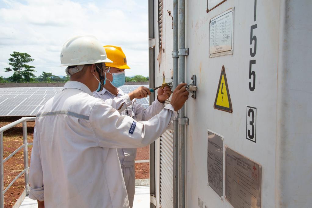 2022年6月2日,在中非共和國首都班吉附近的賓博市,工程師在薩卡伊光伏電站檢修設備。(新華社記者羅毓攝)