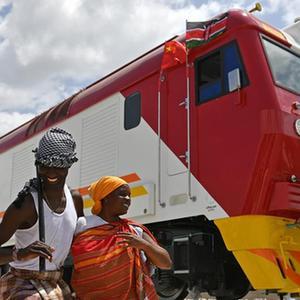 2017年1月11日,在肯尼亞蒙巴薩,當地民眾在中國承制的蒙內鐵路首批內燃機車旁載歌載舞。(新華社記者孫瑞博攝)