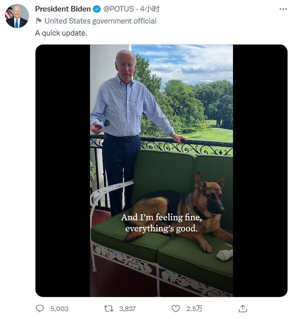 此前,拜登于21日首次確診感染新冠病毒,27日,拜登新冠病毒檢測(cè)結(jié)果為陰性,隨后結(jié)束隔離。