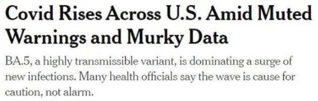 《紐約時(shí)報(bào)》:在疫情持續(xù)兩年多后的今天,許多美國(guó)人已放棄戴口罩等基本防疫做法,最近感染病例激增的很多地方也沒有采取新的限制措施?,F(xiàn)在美國(guó)公共衛(wèi)生官員能做的,只是發(fā)出“安靜的警告”。