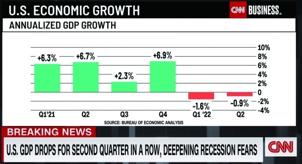 這是美國(guó)經(jīng)濟(jì)連續(xù)兩個(gè)季度萎縮,標(biāo)志著美國(guó)經(jīng)濟(jì)陷入“技術(shù)性衰退”。
