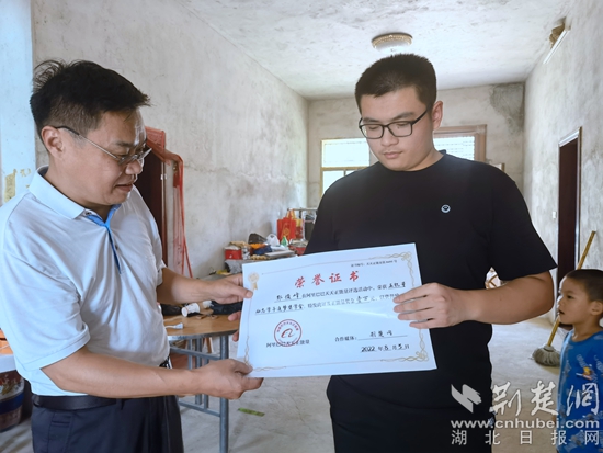 剛吃完飯,中午一時許,鄂州市勞動就業(yè)服務中心副主任、駐郭檔村第一書記曾勝,郭檔村黨支部副書記郭細崇等人趕往郭俊峰家中,將“阿里巴巴天天正能量”的獲獎證書送給郭俊峰。