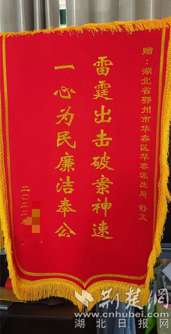 荊楚網(wǎng)(湖北日報(bào)網(wǎng))訊(通訊員 楊逸盟、林露 )8月1日下午,華容派出所一樓值班大廳收到一件來自吉林長春的郵寄包裹,郵遞員表示寄件人要求副所長舒文親自簽收。舒文帶著疑惑拆開封條,赫然入目的是一面印有“雷霆出擊破案神速、一心為民廉潔奉公”的16字紅色錦旗,另有一封600字的手寫感謝信,舒文看完后禁不住眼眶濕潤。