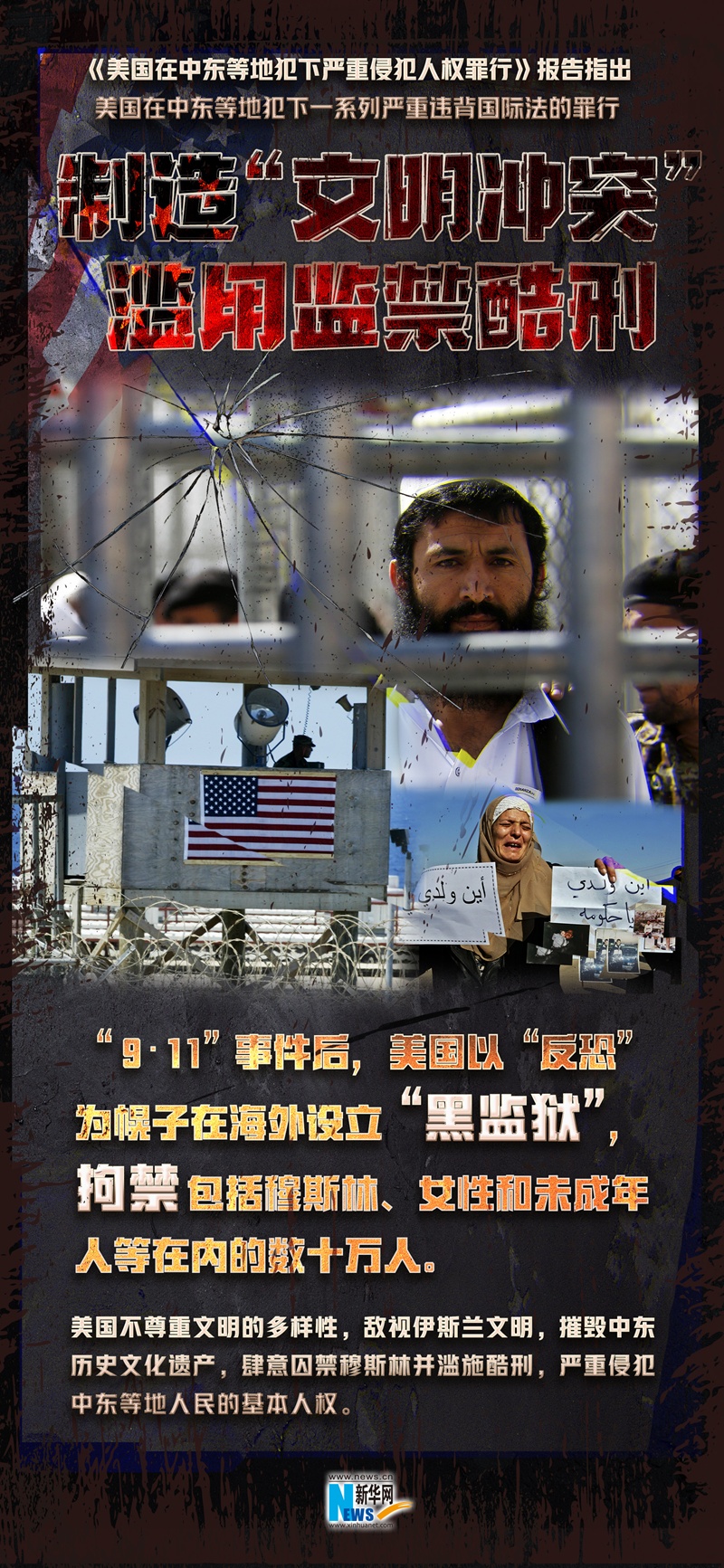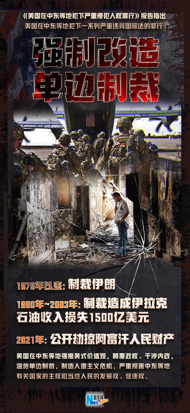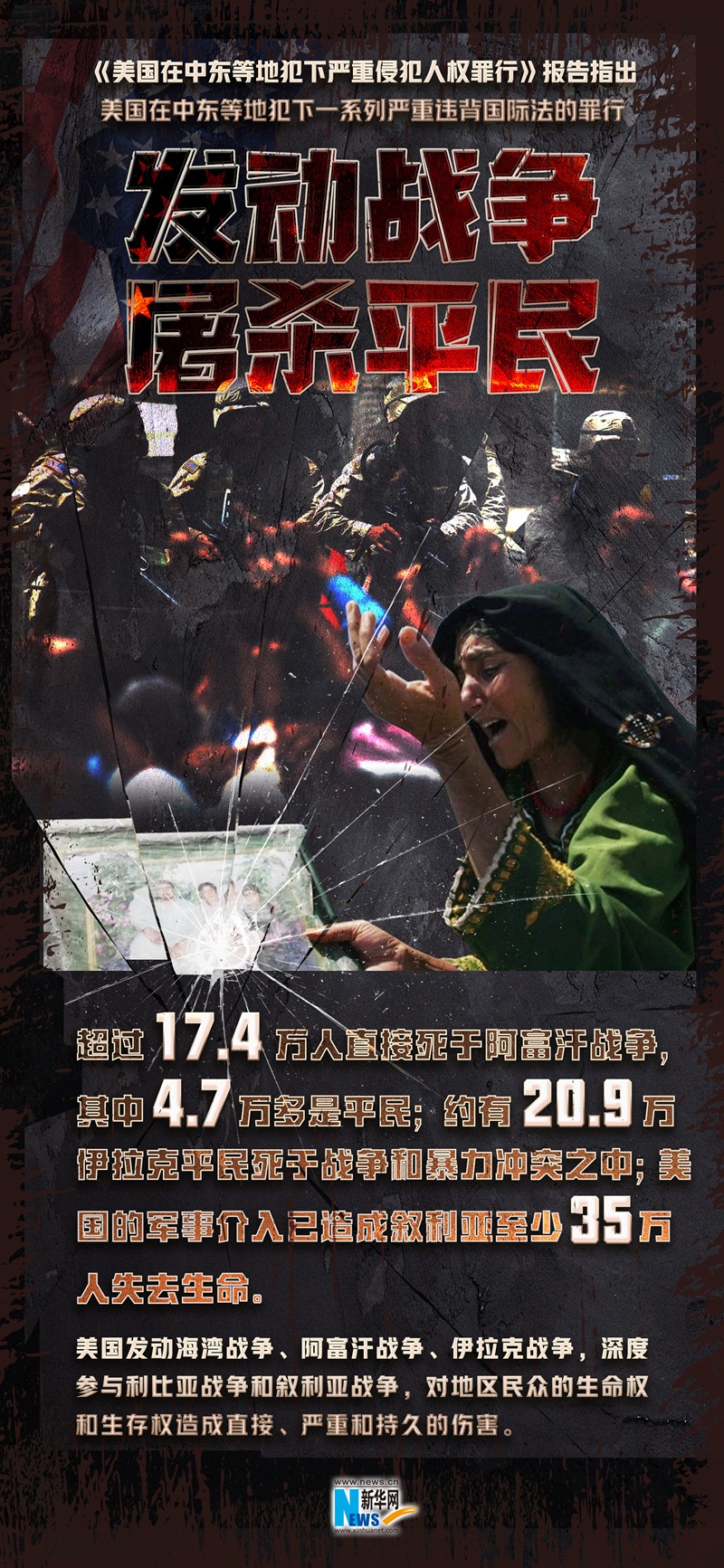 中國人權研究會8月9日發(fā)布《美國在中東等地犯下嚴重侵犯人權罪行》報告,指出美國在中東及其周邊地區(qū)犯下包括戰(zhàn)爭罪、危害人類罪、任意拘押、濫用酷刑、虐囚和濫施單邊制裁等一系列嚴重違背國際法的罪行,構成對人權的系統(tǒng)性侵犯,危害持久而深遠。這也讓世界人民更加認清了“美式民主”與“美式人權”的虛偽性和欺騙性。