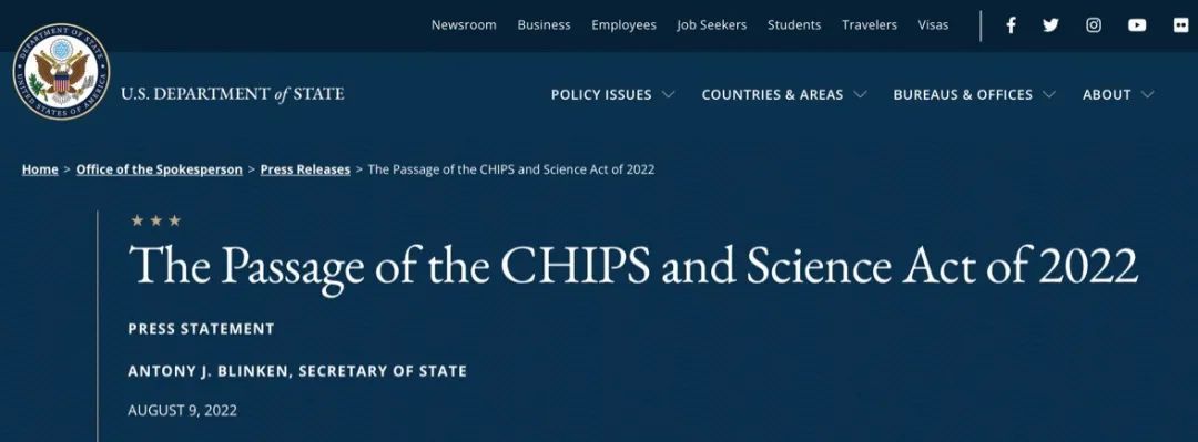 美國《2022年芯片和科學(xué)法案》正式簽署成法。圖源:美國國務(wù)院網(wǎng)站