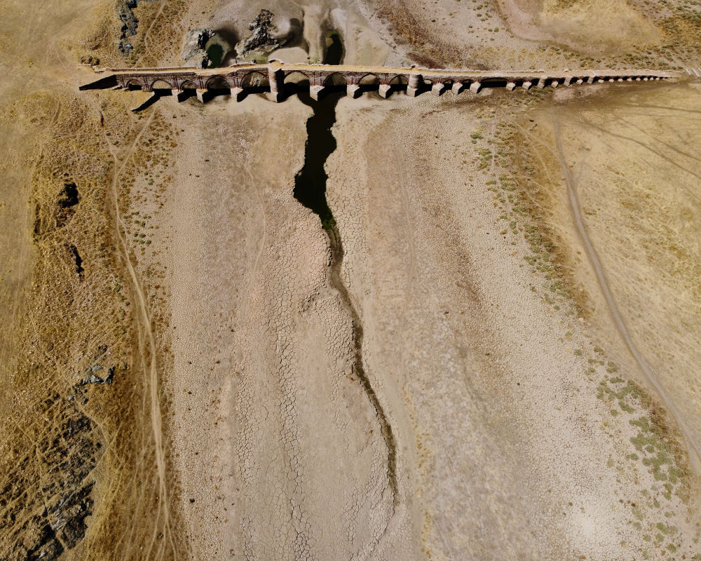 ↑這是8月15日拍攝的干涸的西班牙錫哈拉水庫,上世紀(jì)50年代因水庫落成而被淹沒的梅斯塔古橋重見天日。新華社記者 孟鼎博 攝