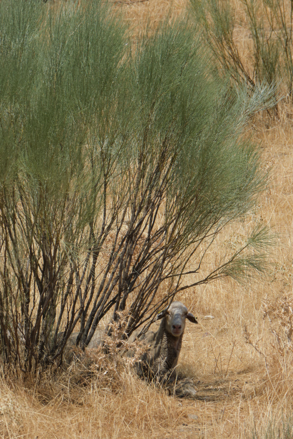 ↑8月15日,一只羊在西班牙錫哈拉水庫附近躲避陽光。新華社記者 孟鼎博 攝