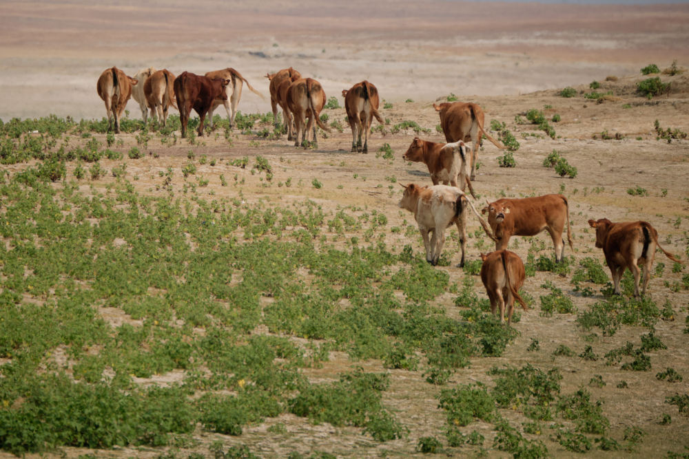 ↑8月16日,牛群在西班牙巴爾德卡尼亞斯水庫附近尋找水源。新華社記者 孟鼎博 攝
