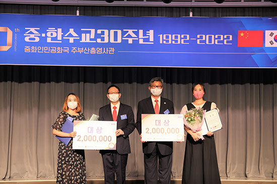 中國(guó)駐釜山總領(lǐng)事郭鵬(左二)和釜山市國(guó)際關(guān)系大使申載鉉(右二)向“我的中國(guó)故事我的韓國(guó)故事”大賽中韓獲獎(jiǎng)?wù)叽眍C獎(jiǎng)。(中國(guó)駐釜山總領(lǐng)事館供圖)