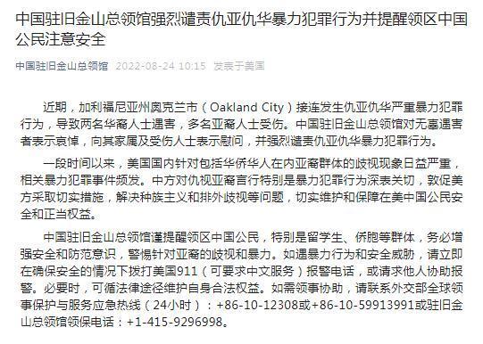 中新網(wǎng)8月24日電 據(jù)中國駐舊金山總領館微信公眾號24日消息,近期,加利福尼亞州奧克蘭市(Oakland City)接連發(fā)生仇亞仇華嚴重暴力犯罪行為,導致兩名華裔人士遇害,多名亞裔人士受傷。中國駐舊金山總領館強烈譴責仇亞仇華暴力犯罪行為并提醒領區(qū)中國公民務必增強安全和防范意識。