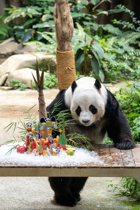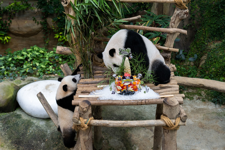 大熊貓爸爸“興興”在館內(nèi)擁有自己的一片領(lǐng)地。他來(lái)到“生日蛋糕”前,一塊一塊細(xì)嚼慢咽,像紳士般優(yōu)雅地享受。