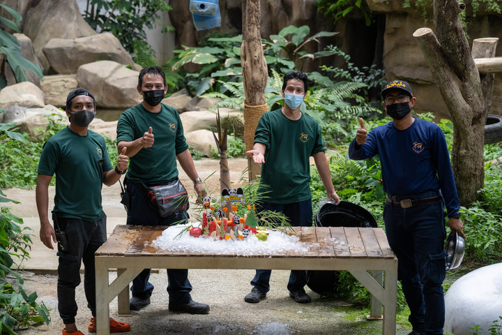 8月23日,在馬來(lái)西亞吉隆坡附近的馬來(lái)西亞國(guó)家動(dòng)物園,飼養(yǎng)員為大熊貓“興興”準(zhǔn)備生日大餐。新華社記者朱煒攝