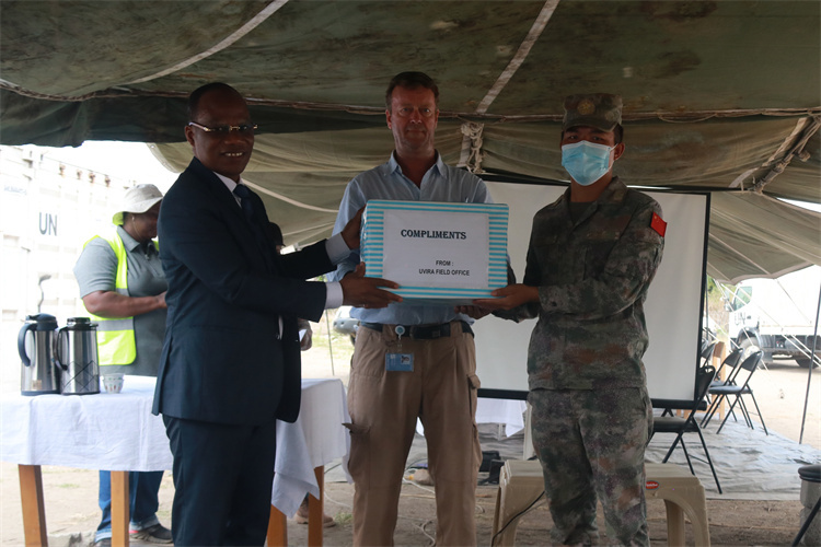 | 聯(lián)剛穩(wěn)定團(tuán)工作人員向我維和官兵贈(zèng)送禮物。中國(guó)第25批赴剛果(金)維和工兵分隊(duì)供圖 |