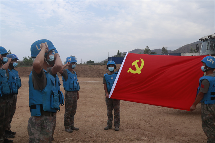 | 任務(wù)一線(xiàn)重溫入黨誓詞。中國(guó)第25批赴剛果(金)維和工兵分隊(duì)供圖 |