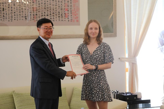 圖為中國駐斯洛伐克大使孫立杰(左一)向衛(wèi)麗云同學(xué)頒發(fā)中國華東師范大學(xué)旅游管理專業(yè)的錄取通知書。記者 王麗麗 攝