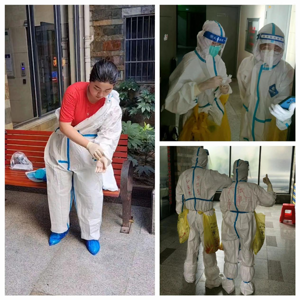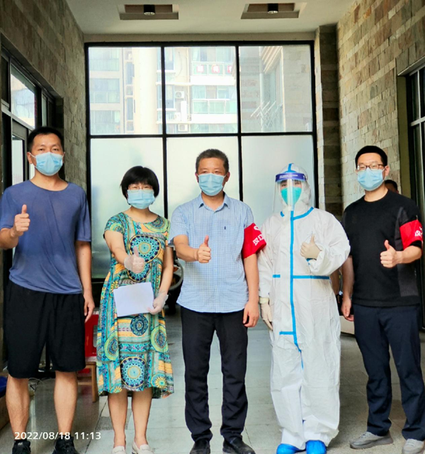 原來(lái),自8月11日0時(shí)起,陽(yáng)光棲谷小區(qū)實(shí)行嚴(yán)格的封控管理,需要進(jìn)行多輪全員核酸檢測(cè)。為提高核酸檢測(cè)采樣效率,需要在每個(gè)樓棟內(nèi)招募志愿者協(xié)助醫(yī)護(hù)人員作業(yè)?!拔沂轻t(yī)務(wù)工作者我可以!”得知消息后,住在6號(hào)樓的九三學(xué)社社員、太和醫(yī)院康復(fù)前移科醫(yī)生李中英主動(dòng)請(qǐng)纓,毫不猶豫地就地上崗。連日來(lái),每次核酸檢測(cè)采樣完畢,脫掉防護(hù)服,李中英都是滿臉通紅、汗流浹背,雙手被橡膠手套里的汗水泡得發(fā)皺發(fā)白。“我是一名醫(yī)務(wù)工作者,這是我應(yīng)盡的職責(zé),疫情面前,自己是業(yè)主,也是志愿者,要帶頭沖鋒在一線”。李中英說(shuō)。