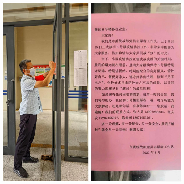 8月15日進(jìn)駐伊始,十堰市委統(tǒng)戰(zhàn)部突擊隊(duì)迅速亮明黨員志愿者身份,發(fā)布封控管理和服務(wù)公告,提出“足不出戶”的管控要求,作出“有事請(qǐng)吩咐——您發(fā)話,我跑腿!”的服務(wù)承諾,在堅(jiān)決落實(shí)封控管理要求的同時(shí),竭力幫助解決居民群眾的“急、難、愁、盼”問(wèn)題。累計(jì)分揀配送生活物資600余份、緊急代購(gòu)藥品4次、代繳燃?xì)怆娰M(fèi)4戶、協(xié)助維修油煙機(jī)1戶、送簽貸款合同1份,贏得了居民群眾的信任和支持,維護(hù)了封控管理的和諧穩(wěn)定。