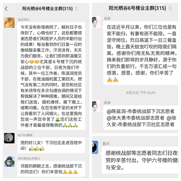 “服好務(wù)”是統(tǒng)戰(zhàn)突擊隊(duì)的使命擔(dān)當(dāng)。“在您無(wú)微不至的關(guān)心下讓我看到了人間煙火,在這里我向您說(shuō)一聲辛苦了!”8月23日下午,市委統(tǒng)戰(zhàn)部駐守的6號(hào)樓業(yè)主龔先生對(duì)突擊隊(duì)員陳茲潤(rùn)滿是感激。他家油煙機(jī)壞了4天,燃?xì)馇焚M(fèi)停氣2天,由于封控管理,吃飯成了難題。市委統(tǒng)戰(zhàn)部突擊隊(duì)獲悉后,多方協(xié)調(diào)爭(zhēng)取,僅半天時(shí)間就幫他家充足了燃?xì)?,修好了油煙機(jī)。