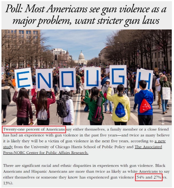 美聯(lián)社聯(lián)合芝加哥大學(xué)NORC公共事務(wù)研究以及芝加哥大學(xué)哈里斯公共政策學(xué)院最新發(fā)布的民調(diào)顯示,21%的美國成年人表示,在過去五年中,自己或親戚朋友經(jīng)歷過槍支暴力,例如被槍威脅或遭到槍擊。而非洲裔和拉丁裔美國人的這一比例則更高,分別是54%和27%。