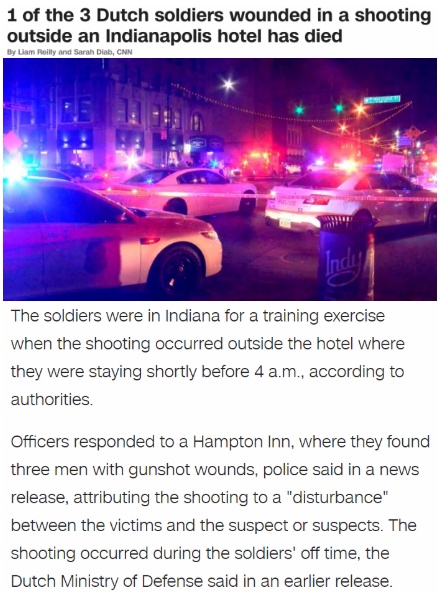 當?shù)貢r間8月27日凌晨,三名在美國接受訓(xùn)練的荷蘭特種部隊的現(xiàn)役軍人在印第安納州首府印第安納波利斯市遭槍擊,一死兩傷 。