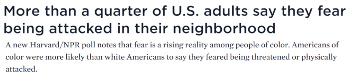 一份哈佛大學(xué)和美國全國公共廣播電臺聯(lián)合進行的民調(diào)顯示,超過25%的美國成年人擔(dān)憂自己所住的社區(qū)會遭到暴力襲擊,并為此感到恐懼,少數(shù)族裔比白人更擔(dān)心受到威脅或人身攻擊。其中,19%的美國白人受訪者有這種擔(dān)憂,而原住民、非洲裔和拉丁裔受訪者中的這一比例分別為36%,25%和26%。