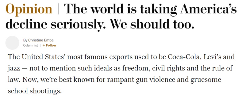 《華盛頓郵報》發(fā)表題為《世界正在認真對待美國的衰落 我們也應(yīng)該》的評論文章