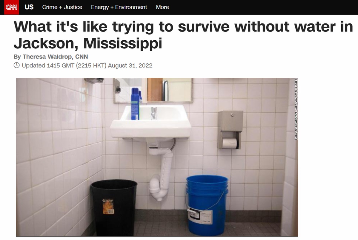 此外,美國有線電視新聞網(wǎng)近日?qǐng)?bào)道稱,密西西比州首府在連續(xù)無法正常供水后的第五天,居民們?nèi)员桓嬷幚韽S的維修工作還在繼續(xù)。在炎熱的夏天之際,他們甚至不得不用水龍頭里棕色的水來洗澡,洗澡時(shí)得“閉上嘴巴“。一些居民不得不排長隊(duì)購買瓶裝水,學(xué)校和企業(yè)被迫關(guān)閉。
