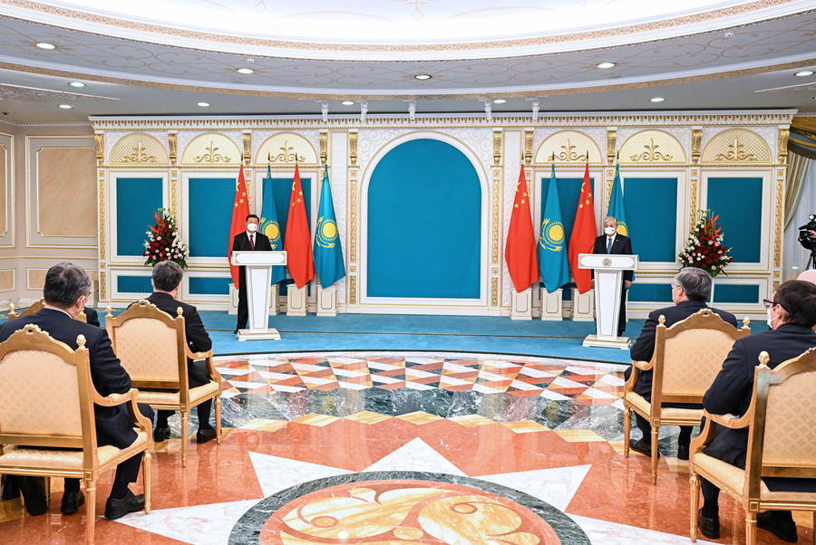 新華社努爾蘇丹9月14日電 當(dāng)?shù)貢r間14日下午,努爾蘇丹總統(tǒng)府大理石廳,一個莊重的時刻。