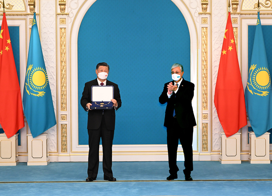 托卡耶夫總統(tǒng)在致授勛辭時說,習(xí)近平主席是一位真正的偉大領(lǐng)袖,得到中國人民的衷心擁護(hù)。在習(xí)近平主席卓越領(lǐng)導(dǎo)下,中國取得偉大發(fā)展成就,消除了絕對貧困,全面建成了小康社會,中華民族偉大復(fù)興進(jìn)入新征程。相信在習(xí)近平主席英明領(lǐng)導(dǎo)下,中國必將如期實現(xiàn)全面建設(shè)社會主義現(xiàn)代化國家的宏偉目標(biāo)。習(xí)近平主席提出共建“一帶一路”和構(gòu)建人類命運共同體的偉大倡議,為推動建設(shè)新型國際關(guān)系作出杰出貢獻(xiàn)。習(xí)近平主席提出的全球發(fā)展倡議和全球安全倡議,對于解決當(dāng)今世界面臨的風(fēng)險挑戰(zhàn)具有重要戰(zhàn)略意義。
