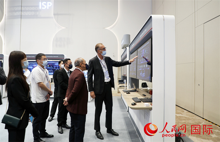 | 在華為全聯(lián)接大會的展覽區(qū),一名參會者正在同機(jī)器人互動。人民網(wǎng)記者 趙益普攝 |