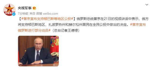 據(jù)@央視軍事 微博消息,俄羅斯總統(tǒng)普京在21日的視頻講話中表示,俄方將支持頓巴斯地區(qū)、扎波羅熱州和赫爾松州居民在全民公投中做出的決定。(總臺(tái)記者 王德祿)