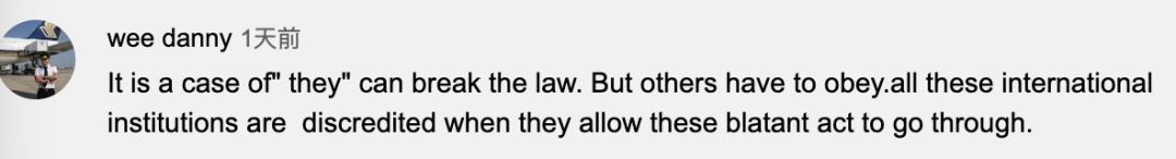 英語網(wǎng)友wee danny:“這又是一個(gè)雙標(biāo)案例?!承﹪摇梢赃`反,但其他人必須服從。所有允許這種明目張膽的雙標(biāo)行為的國際機(jī)構(gòu),都將名譽(yù)掃地。”