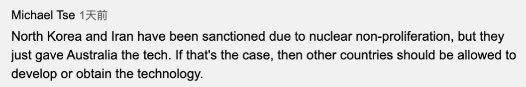 英語網(wǎng)友Michael Tse:“朝鮮和伊朗因不擴(kuò)散核武器條約而受到制裁,但美國和英國把技術(shù)給了澳大利亞。如果可以這么做的話,那么其他國家應(yīng)該被允許開發(fā)或獲得核技術(shù)。”