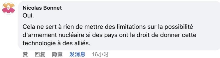 法語網(wǎng)友Nicolas Bonnet:“是的。如果各國有權(quán)將這種技術(shù)提供給盟友,那么限制核武器是沒有意義的。”