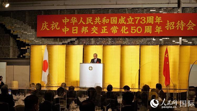 人民網(wǎng)東京9月23日電(吳穎)慶祝中華人民共和國成立73周年暨中日邦交正?;?0周年招待會22日在日本東京舉行。駐日本大使孔鉉佑、日本前首相福田康夫、鳩山由紀(jì)夫,外務(wù)大臣政務(wù)官吉川有美,公明黨代表山口那津男、立憲民主黨代表泉健太、社民黨黨首福島瑞穗等日政府和朝野政黨負(fù)責(zé)人,眾議院副議長海江田萬里、前自民黨干事長二階俊博、日中友好議員聯(lián)盟事務(wù)局長小淵優(yōu)子等眾參兩院30余名國會議員,前首相田中角榮之女、前外務(wù)大臣田中真紀(jì)子,日本經(jīng)團(tuán)聯(lián)會長十倉雅和、日本國貿(mào)促會長河野洋平、日中協(xié)會會長野田毅、日中友好會館會長代行宮本雄二等經(jīng)濟(jì)界、友好團(tuán)體、主流媒體、在日中資機(jī)構(gòu)、僑團(tuán)負(fù)責(zé)人,各國駐日使節(jié)等300余人出席。