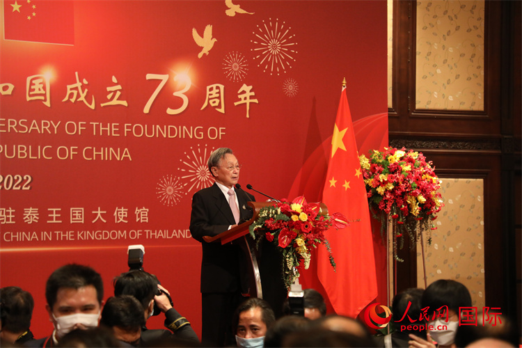 泰國(guó)國(guó)會(huì)主席兼下議院議長(zhǎng)川·立派在致辭中表示,去年慶祝了中國(guó)共產(chǎn)黨成立100周年,今天祝福新中國(guó)成立73周年。在中國(guó)共產(chǎn)黨的帶領(lǐng)下,中國(guó)取得了巨大的發(fā)展成就,泰中關(guān)系也實(shí)現(xiàn)了持續(xù)穩(wěn)定。新冠疫情延宕3年,但中國(guó)對(duì)泰國(guó)的抗疫援助和支持,也再次證明了泰中政府和人民之間的友好情誼。泰方期待同中國(guó)駐泰使館繼續(xù)密切合作,共同推動(dòng)兩國(guó)關(guān)系穩(wěn)定、可持續(xù)發(fā)展。