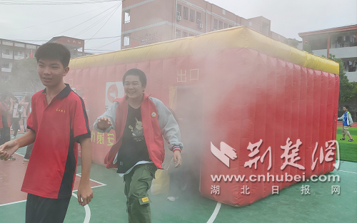 “發(fā)生火災(zāi)后,正確佩戴面罩,會(huì)為逃生贏得寶貴時(shí)機(jī),但戴面罩時(shí)一定要記得取掉蓋子,確保能正常呼吸。”23日上午,防災(zāi)減災(zāi)科普主題“應(yīng)急演練”在馬港中學(xué)操場(chǎng)開展。當(dāng)天8時(shí)30分許,應(yīng)急演練活動(dòng)正式開始,該校100多名中學(xué)生圍著操場(chǎng)站成一圈,與來(lái)自無(wú)憂熊安全教育機(jī)構(gòu)的老師們現(xiàn)場(chǎng)互動(dòng)熱身。通過(guò)老師講解應(yīng)急包、滅火器的使用,模擬火災(zāi)后如何穿越濃煙逃生等等,學(xué)生進(jìn)一步了解了安全應(yīng)急知識(shí),并學(xué)會(huì)正確使用、佩戴安全裝備。