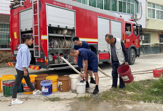 英山縣消防救援大隊(duì)接警后,立即調(diào)派一輛水罐消防車和三名消防員趕往離縣城二十多公里外的南河鎮(zhèn)占昌塆村,分別為兩個小組村民送水解民憂。