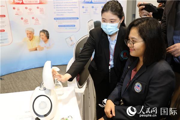 展覽會(huì)現(xiàn)場(chǎng),泰國(guó)民眾體驗(yàn)中醫(yī)藥最新診斷設(shè)備。人民網(wǎng)記者 趙益普攝