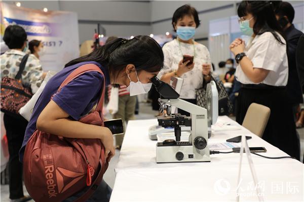 展覽會(huì)現(xiàn)場(chǎng),泰國(guó)民眾體驗(yàn)中醫(yī)顯微鏡設(shè)備。人民網(wǎng)記者 趙益普攝
