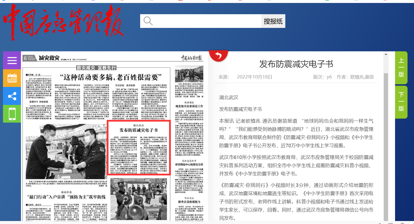 《防震減災·你我同行》小視頻時長3分鐘,通過動畫形式介紹地震的形成、武漢地震環(huán)境和地震逃生等知識?!吨行W生防震手冊》首次采用電子書的形式發(fā)布,老師作線上講解??破招∫曨l和電子書通過線上發(fā)送給學生家長,可以保存、回看。同時,通過武漢市應急管理局微信公號向市民發(fā)布。