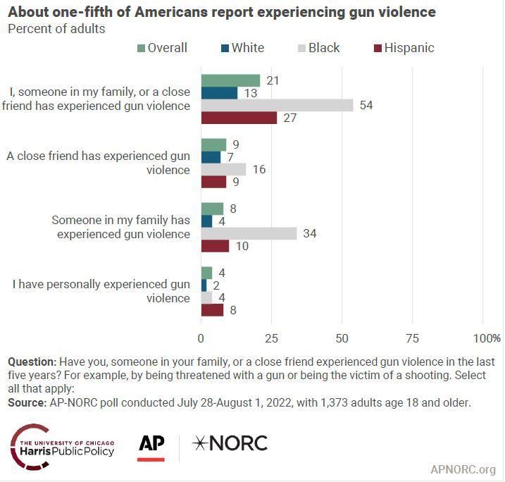 美國芝加哥大學(xué)哈里斯公共政策學(xué)院和美聯(lián)社公共事務(wù)研究中心聯(lián)合舉行的民意調(diào)查發(fā)現(xiàn),有五分之一的受訪者表示,過去五年中親身經(jīng)歷過槍支暴力事件或其身邊人經(jīng)歷過槍支暴力事件。圖片來源:相關(guān)報(bào)告截圖