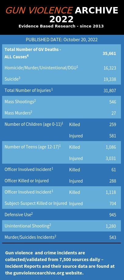 美國“槍支暴力檔案”網(wǎng)站數(shù)據(jù)顯示,截至10月20日,2022年美國已發(fā)生546起大規(guī)模槍擊事件,已有超過1300名未成年人死于槍支暴力。圖片來源:美國“槍支暴力檔案”網(wǎng)站官網(wǎng)截圖