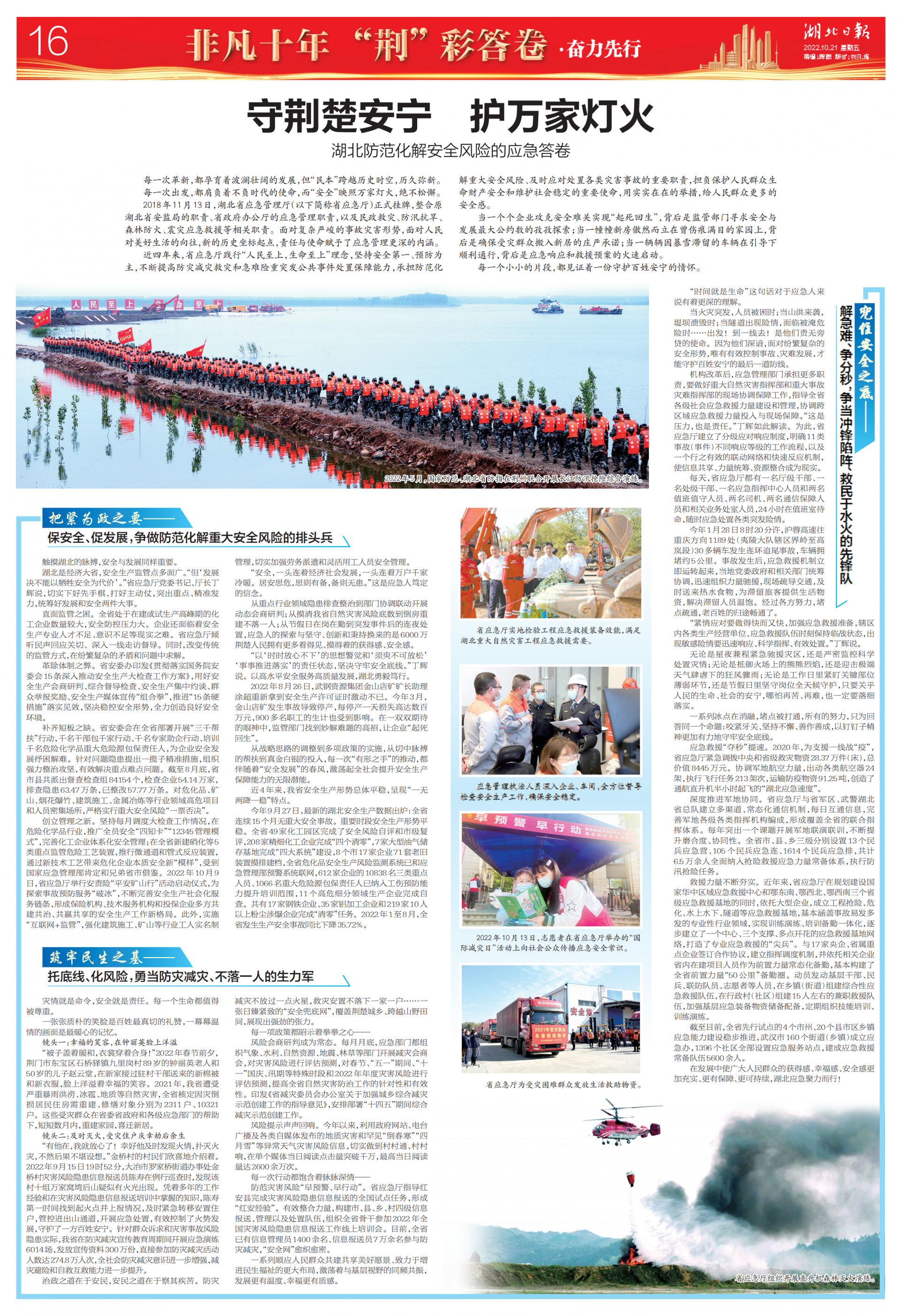 從重點行業(yè)領(lǐng)域隱患排查整治到部門協(xié)調(diào)聯(lián)動開展動態(tài)會商研判;從摸清我省自然災(zāi)害風(fēng)險底數(shù)到倒房重建不落一人;從節(jié)假日在崗在勤到突發(fā)事件后的連夜處置,應(yīng)急人的探索與堅守、創(chuàng)新和秉持換來的是6000萬荊楚人民擁有更多看得見、摸得著的獲得感、安全感。