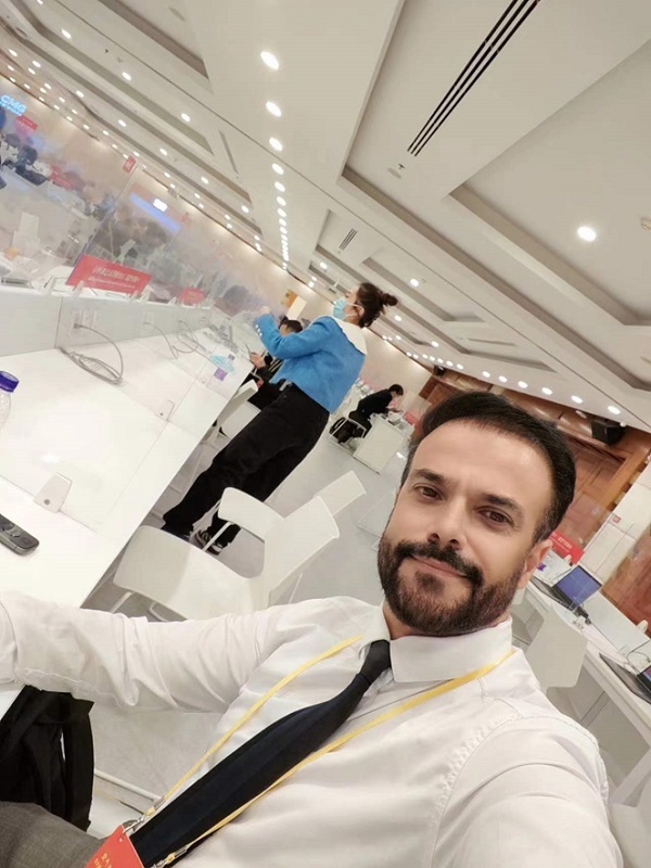 伊拉克新聞集團記者、播音主持薩米·阿卜杜勒埃米爾·阿布德在二十大新聞中心記者工作區(qū)。受訪者供圖