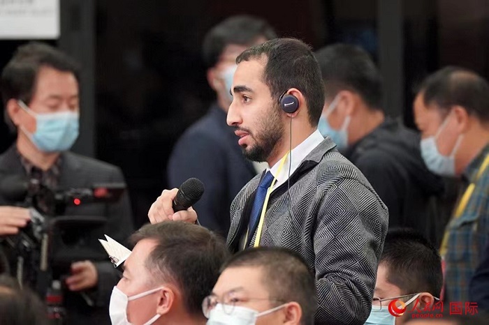 費(fèi)薩爾·薩阿迪在中國共產(chǎn)黨第二十次全國代表大會記者招待會上提問。人民網(wǎng)記者 張若涵攝