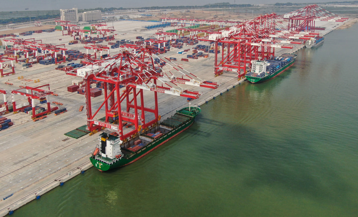 這是7月28日拍攝的廣州港南沙港區(qū)四期全自動化碼頭(無人機照片)。 新華社記者 鄧華攝