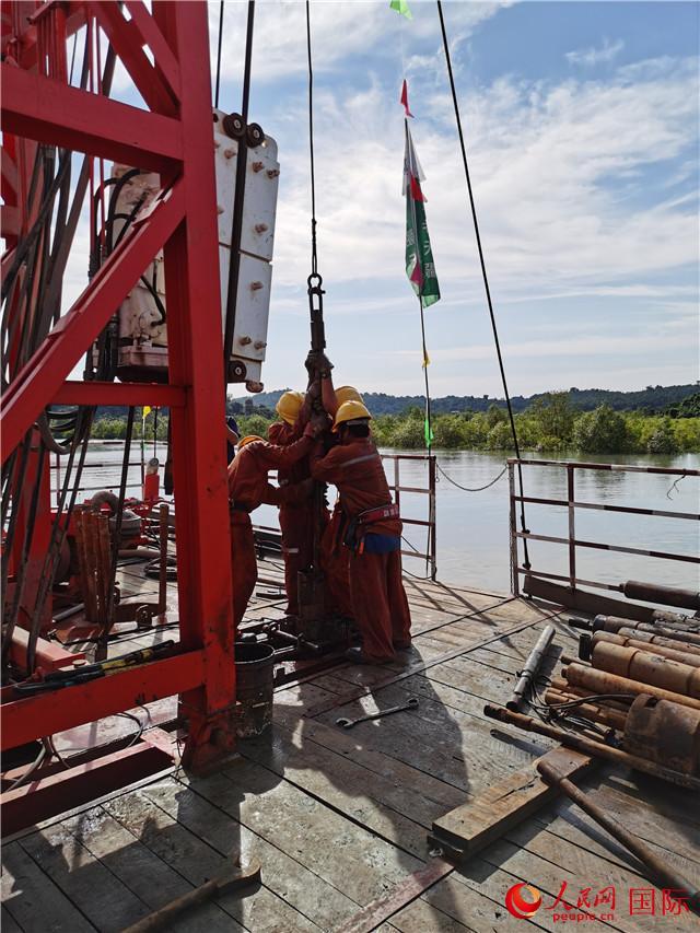 人民網(wǎng)緬甸皎漂11月9日電 (記者李秉新)我國(guó)在緬甸重點(diǎn)項(xiàng)目皎漂深水港水上物理探測(cè)和路上物理探測(cè)都已開(kāi)始進(jìn)行。9日記者在海上物理探測(cè)現(xiàn)場(chǎng)看到工人們冒著烈日汗流浹背地將一根根探測(cè)管打入海底獲取海底固體物質(zhì)樣品,然后再將樣品送到實(shí)驗(yàn)室進(jìn)行分析研究。