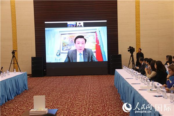 中國(guó)駐哈薩克斯坦大使張霄通過(guò)視頻致辭。人民網(wǎng)記者 周翰博攝